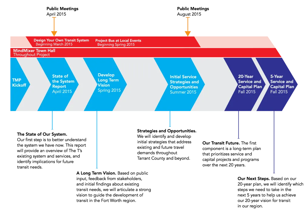Great transit service supports stronger and healthier communities. The T Master Plan will develop a vision and guide for building great transit in our region over the next 20 years and with a particular emphasis on the next 5 years.